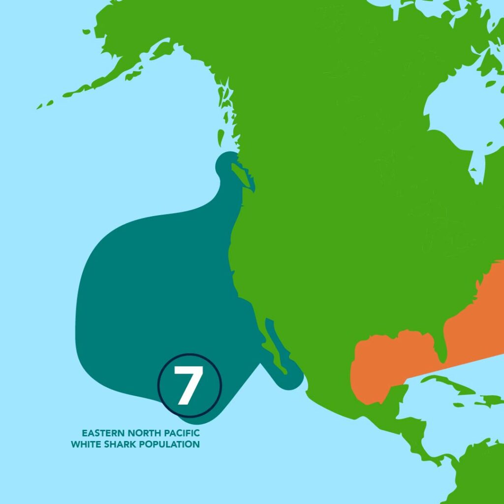 White sharks in the Eastern North Pacific range from Alaska to Mexico and west to Hawaii. Core habitats include the California and Mexican coasts, the waters around Hawaii, and a seasonal offshore foraging zone known as the “White Shark Café” (SOFA). This well-studied population is thought to be stable or even increasing. From 2007–2010, OCEARCH pioneered its research methods here, studying over 40 sharks and identifying key habitats critical to their survival.