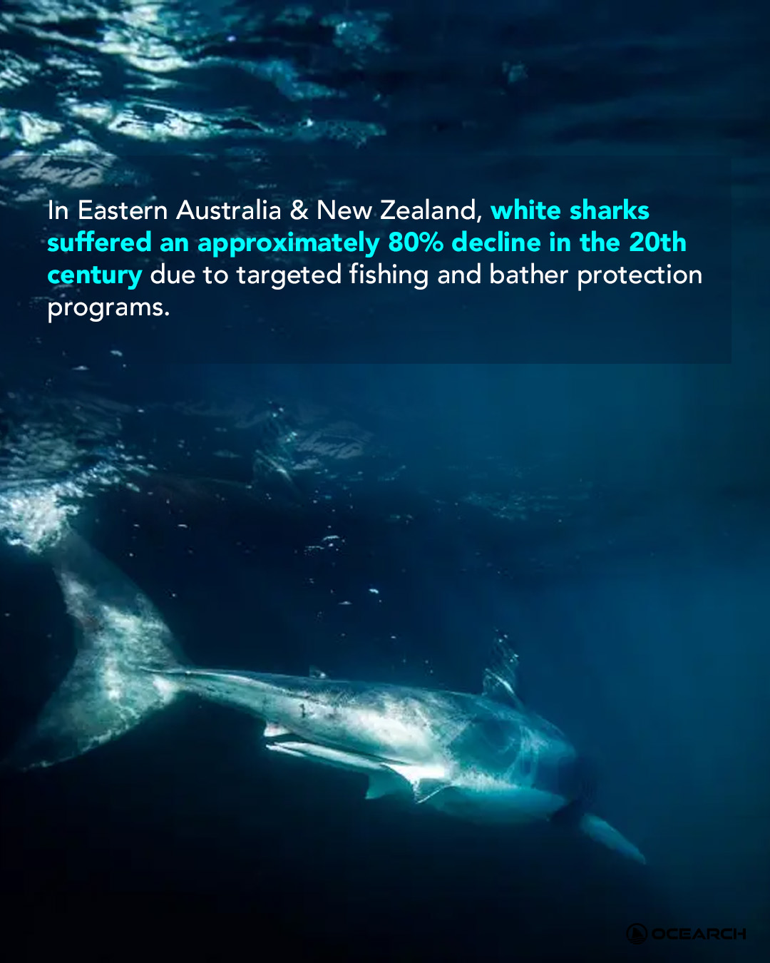 In Southwest Australia, protections introduced in the 1990s have helped stabilize numbers, but there is still no clear evidence of recovery. Clark et al. 2025 showed a lack of genetic structure between white sharks from eastern and southern Australia.